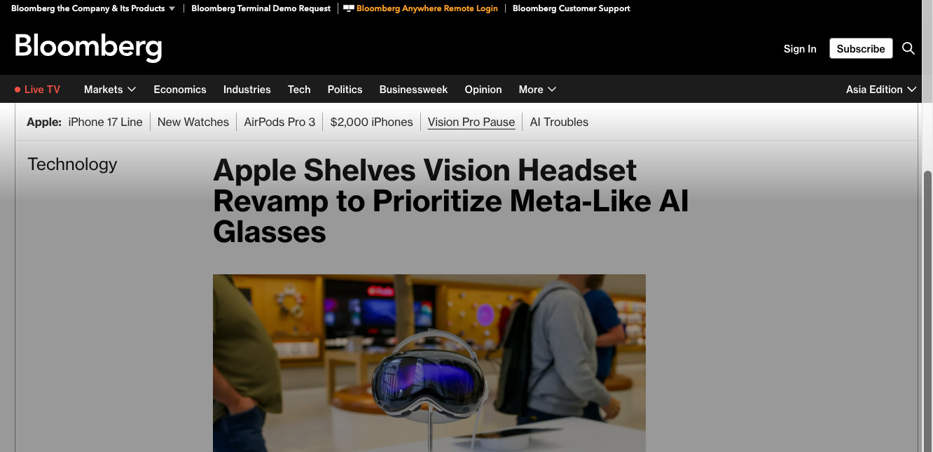 블룸버그 통신은 비전 프로에 대한 소비자들의 관심을 끌려는 애플의 시도는 실패했다며 애플은 점점 더 이 기기의 마케팅을 기업 대상으로 전환하려 하고 있다고 전했다. 애플이 스마트 안경 개발에 집중하기로 한 것은 인공지능(AI) 기능을 탑재한 스마트 안경이 스마트폰을 대체할 차세대 기기로 부상하고 있기 때문이다. 메타는 스마트 안경 개발의 선두 주자로, 2021년 처음 선을 보인 이후 2023년에 출시한 '레이밴 메타'가 성공을 거두었다. 이에 지난달에는 개선된 카메라, 더 길어진 배터리 수명, 운동선수에게 맞춘 새로운 디자인으로 디스플레이가 없는 스마트 안경을 공개했다. 특히, 디스플레이가 처음 장착된 AI 기반의 스마트 안경 '메타 레이밴 디스플레이'를 출시하고 지난달 30일부터 판매에 들어갔다.